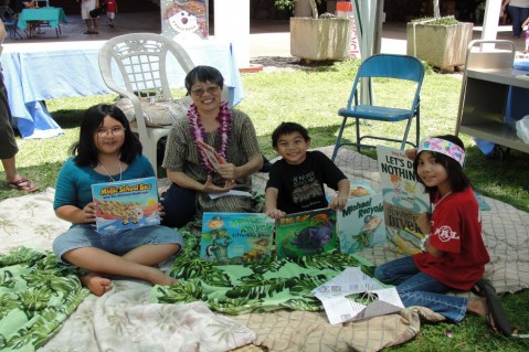 Volunteer Storyteller, Arlene Seto Ching from the Waipahu Public Library pictured with some of the keiki who had an opportunity to listen to her as she read from a selection of children's books.