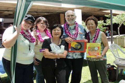Storyteller Coordinator Norma Matsuhara (center) pictured with (left to right) Taryn Hall (LCC Actor), Chelsea Campbell (LCC Actor), Matsuhara, Jim Shepherd, Librarian (Ret.) Fort Shafter Library, Cathy Shepherd, Teacher (Ret.) Kaala Elementary School.