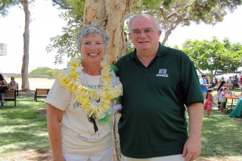 Mahalo to Leeward Community College Administrators and Ka Mole o Na Pua Festival coordinators (left) Roberta "Bobbie" Martel, Coordinator, Supportive Teacher Education Program and (right) Mike Pecsok, Vice-Chancelor of Academic Affairs.