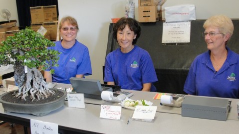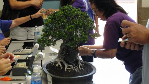 PCBC volunteer checking in and preparing a sold bonsai tree for its new home.