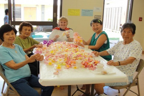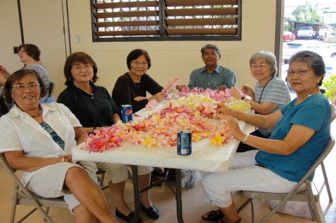 Waiau Senior Club members from Pearl City, teamed up with other District 3 Senior Clubs and the Mana Loa-Nimitz Lions Club on Friday, May 28, 2010 to string and pack plumeria leis for Monday's Memorial Day Service at Punchbowl National Cemetery in Honolulu.