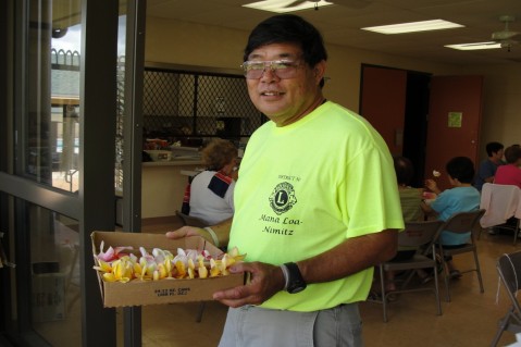 Mana Loa-Nimitz Lions Club member, Vern Miyake was kept busy collecting finished leis to be packed for Sunday's delivery to the Boys Scouts at Punchbowl National Cemetary.