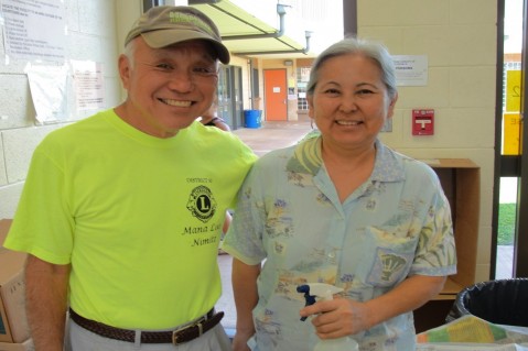 Mana Loa-Nimitz Lions Club member, Warren Hiromoto (left) and Pat Davison from Pearl City. Warren served as the all around "go to guy" on Friday. Pat was responsible for making sure the flowers and packing materials were sprayed to keep the flower leis cool. (They both did a great job!)