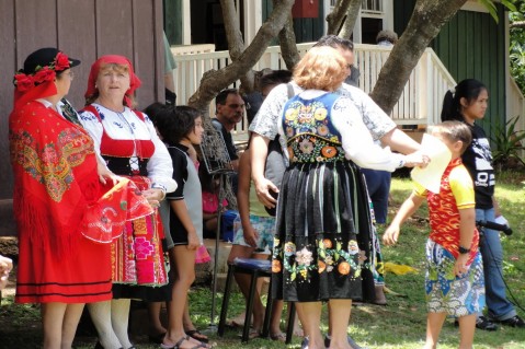 Portuguese women dressed in traditional attire pictured at the recent Portuguese Festival held at the Waipahu Viilage Plantation in June. The Portuguese Genealogical & Historical Society also participated in the Festival.