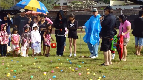 Shige Ushiro ( pictured in blue raincoat ) volunteering at the 2010 Manana Community Association Easter Egg Hunt.