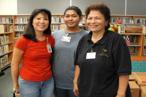 Lehua Elementary School staff members, Kari Wong, Mahealani Tupu and Patty Ballungay worked the first shift of the morning restocking the library shelves.