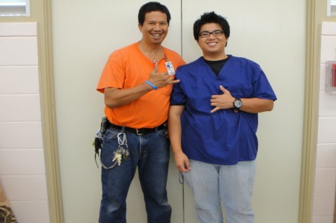 Mr. Michael Lani (left) posing with Lehua Elementary School Faculty member, Mr. (Mike) Ulep. Lani and Ulep are standing in front of a set of library doors that will soon feature Mr. Ulep's original art designs.