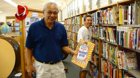 Mission accomplished! Pearlridge Rotary Club volunteers, Roy Matsuo (left) and Gordon Arakaki (right) picking out their favorite books.