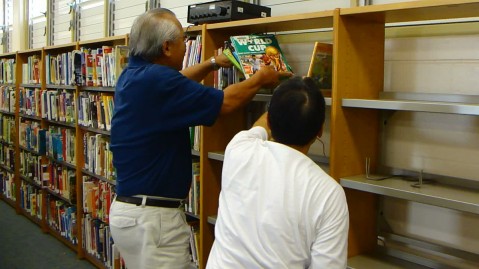 Pearlridge Rotary Club volunteers, Roy Matsuo (left) and Gordon Arakaki (right) spent the morning on Wednesday, August 11, 2010 helping restock the book shelves in the newly renovated Lehua Elementary School Library.