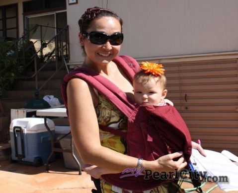 Baby Charlie pictured with mommy after a long day of collecting food donations in Pearl City.