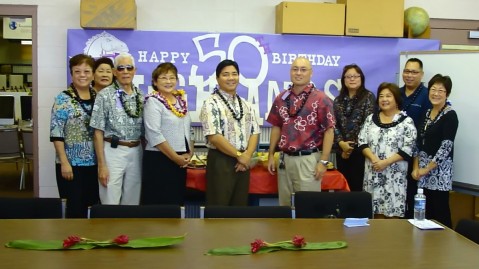 HIS Principal, Amy Martinson (4th from left) and former HIS Principal, Shige Ushiro (3rd from left) pose with Pearl City District Complex Principal's and staff during the HIS 50th Anniversary Celebration on March 11, 2010.