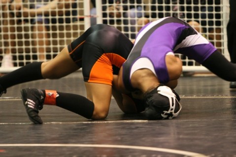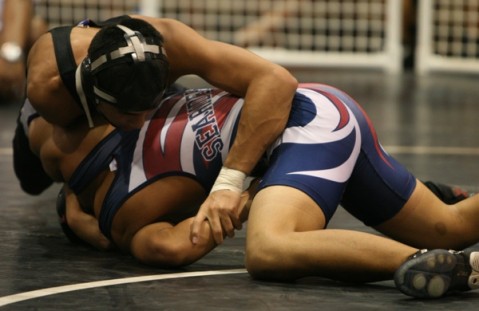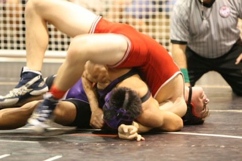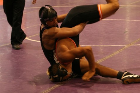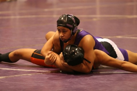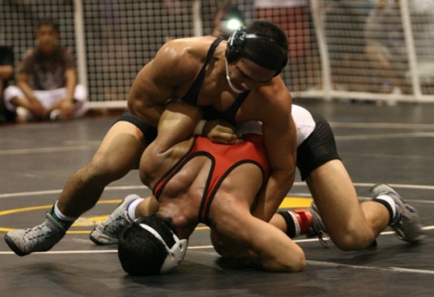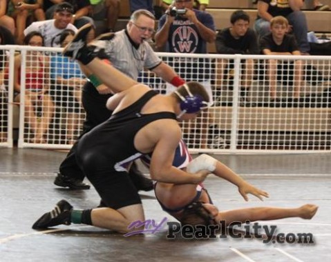 Pearl City's Evan Greenleaf defeated Sheldon Maae from Campbell High School for the 215 Lbs. Varsity Boys Title. ( Evan Greenleaf pictured winning semifinal match).