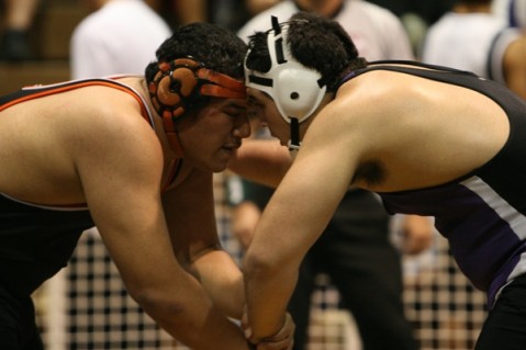 Devin Ching (right) won the 285 Lbs. Varsity Boys Title 5-4 over Isaiah Thompson from Campbell High School.