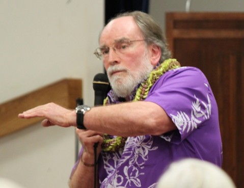 Retired Honolulu Police Officer Manny Mattos pictured during the Q&A portion of last night's town hall meeting.