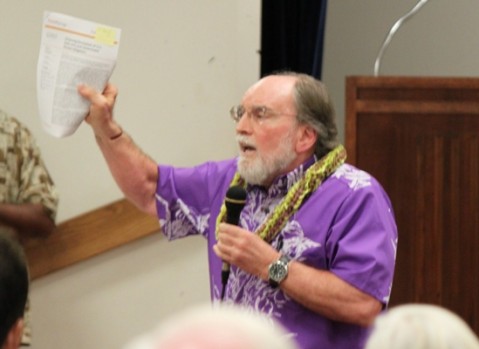 Manny Mattos from Leeward Oahu, a retired Honolulu Police Officer who retired under disability, stepped up to the microphone to express his concerns of the administrations proposed elimination of Medicare Part B reimbursements which is currently on shaky ground at the state Legislature.