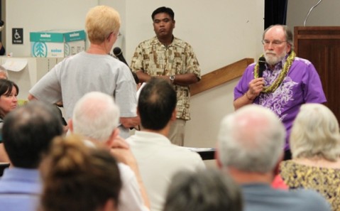 Around four hundred residents attended the town hall meeting that was sponsored by Senators Glenn Wakai, Donna Mercado Kim, Clarence Nishihara, David Ige and Representatives Roy Takumi and K. Mark Takai.