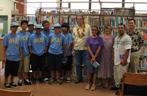 Award winning baseball novelist, John Ritter made a visit to the Pearl City Public Library on Thursday, February 17, 2011 to honor and celebrate the accomplishments of Hawaii's Waipio Little League 2010 US World Series Champions, the Mililani Po`okela girls softball team, 2010 ASA Girls 14-Under Class B Fast Pitch Western National Champions; and the Central Oahu Wahine softball team, Champions of three 2010 national tournaments.
