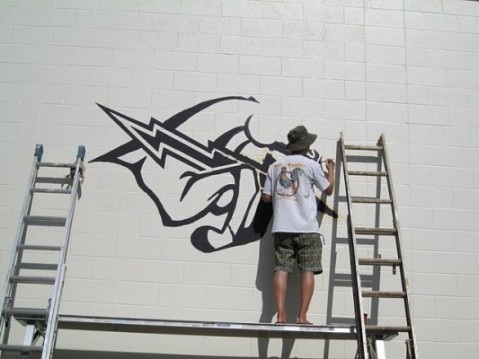 HIS new logo being painted on school library wall.