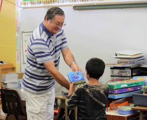 Dick Mosko presenting a dictionary to Waiau Elementary School third grade student.