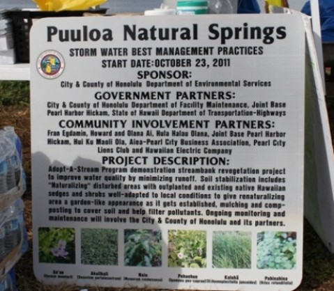 At the Puuloa Natural Springs Adopt-A-Stream shoreline area near Blaisdell Park, residents have taken to adopt the area and serve as community caregivers. The results have improved and helped beautify the bike path.