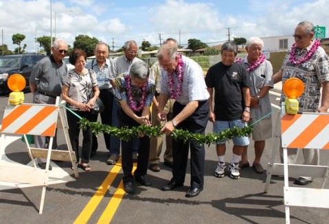 Another one of the PCCA community service projects was to provide lunch for the crowd attending the dedication and opening of Kaakepa Street in Pearl City on June 29, 2011. Fujimura is pictured (3rd from right) as Mayor Peter Carlisle and Honolulu City Councilman Breene Harimoto cut the ceremonial maile lei to open Kaakepa Street.