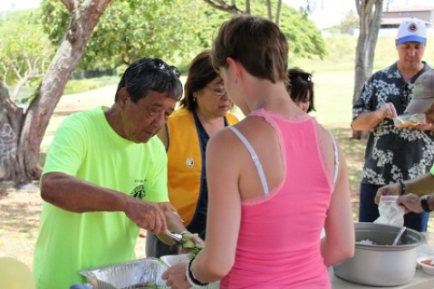 Fujimura pictured with Mana Loa-Nimitz Lions Club members serving lunch to a group of 22 International Youth Camp students from around the world on Wednesday, July 13, 2011 at the Rainbow Park/Shizuo Pavilion on the historic shores of Pearl Harbor in Aiea.