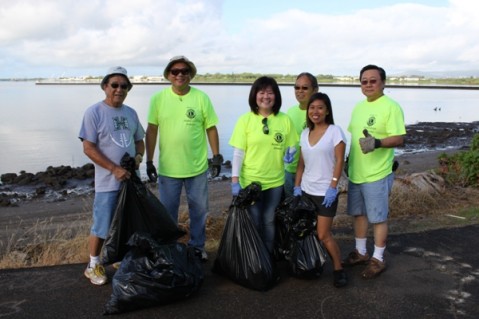 Mana Loa-Nimitz Lions Club volunteers pictured with bags of rubbish picked up during the annual Pearl Harbor Bike Path Clean Up Day in April 2011. Fujimura pictured (far left) in gray shirt.