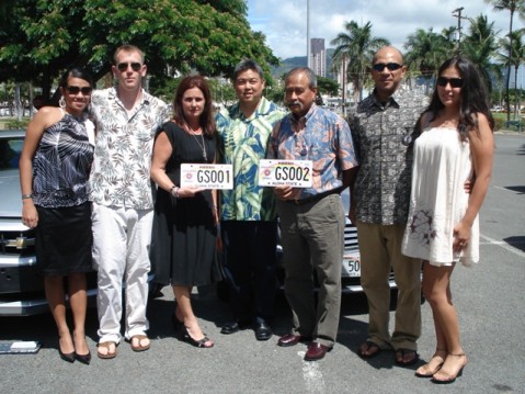 Representative K. Mark Takai is joined by Mary Jo & Blake Brostrom, mother and brother of Army First Lieutenant Jonathan Brostrom and Allen Hoe, father of Army First Lieutenant Nainoa Hoe, and friends of the Brostrom family to unveil the Hawaii Gold Star family License Plate (from left to right): Diana Gomez, Blake Brostrom, Mary Jo Brostom, Representative K. Mark Takai, Allen Hoe, Nathan Esafe, and Fiorella Zarate-Marquez.