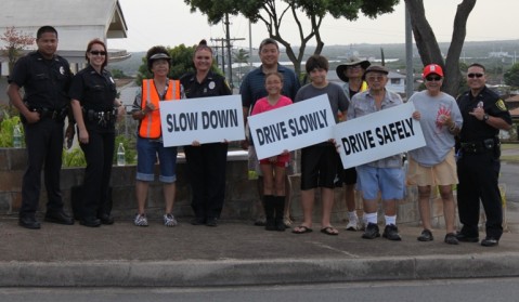 Community volunteers from CTAP – Community Traffic Awareness Program joined HPD and Representative K. Mark Takai on Tuesday, October 25, 2011 to conduct another sign waving campaign to slow down traffic on Hoomalu Sreet in Pearl City.