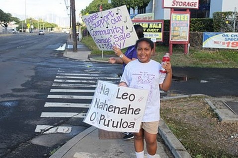 Pearl City Elementary School choir members from Na Leo Nahenahe O' Pu'uloa pictured near the entrance to the Pearl City Hawaii Self Storage location during school's garage sale.