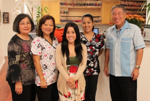 (Left to right) Judy Sasamura (Office Manager), Kris Gabriel (Hygienist), Jaylyn Perry (Receptionist), Kimberly Shimonishi (Dental Assistant) and Dr. Glenn Okihiro.