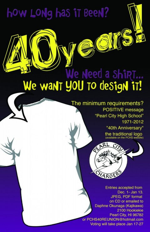 Can you believe it? Pearl City High School is turning 40 years old! That's right, 40 years of Charger Pride from1971-2012. The PCHS 40th Anniversary organizing committee is calling on all alumni and current students to help design the official PCHS 40th Anniversary T-shirt.