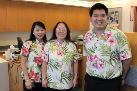 Shawn Taniguchi pictured with his staff, Maribel Carvalho (left) and Valarie Igawa (center) at the Finance Factors, Pearl City Shopping Center location.