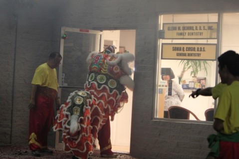 The traditional lion dance blessing began at 5:30pm at Daves's Ice Cream and proceeded around the Pearl City Shopping Center blessing the merchants and their businesses before ending at the House of Dragon Chinese Restaurant at around 7:00pm.