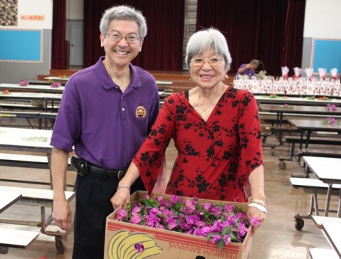Waiau Seniors Club President Mary Takeshita is pictured with Honolulu City Councilman and Pearl City Community Association (PCCA) Board member Breene Harimoto at the Pearl City Highlands Elementary School cafeteria on January 28, 2012. Takeshita and her Waiau Senior Club volunteers helped decorate the cafeteria with beautiful flowers for the annual PCCA Installation Dinner.