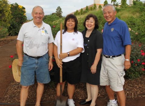 The Honolulu Rose Society and Urban Garden Center received support from the Pearlridge Rotary Club who sent a group of volunteers to help out with the initial development of the original rose beds which included digging out the rose bed plots, preparing the soil and planting over 120 rose plants.
