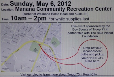 Pearl City Boy Scouts Troop 75 will be distributing free CFL light bulbs (while supplies last) for every incandescent light bulb dropped off this Sunday, May 6, 2012 at the Manana Community Recreation Center.