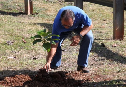 Vaughn Miyauchi from the Pearl City Lions Club pictured setting one of the Kou trees in place.