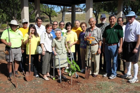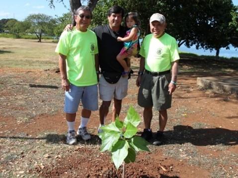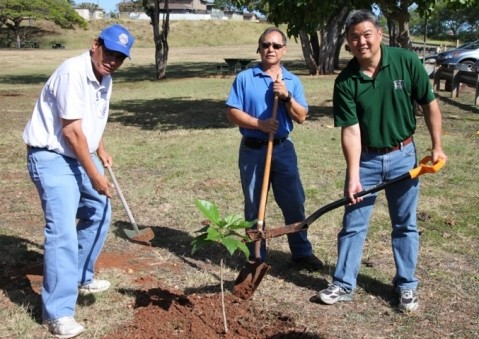 Volunteers from the Pearl City Lions Club, Aiea Lions Club and Mana Loa-Nimitz Lions Club came together to help plant two Kou trees at Rainbow Bay Park (Onishi Pavilion) in Aiea on Tuesday, May 15, 2012.