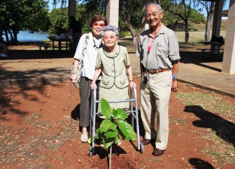 Mrs. Umeno Onishi (wife), daughter Charlotte Murakami and husband Arthur Murakami attending the special tree planting ceremony on Tuesday. The Rainbow Bay Park / Onishi Pavilion sits in a former fishing village and the very same spot that Shizuo Onishi grew up as the son of a fisherman along the Pearl Harbor shore in Aiea in the early 1920' and 30's.