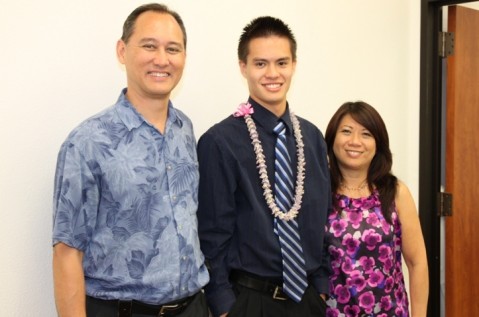 Adam Murata pictured with proud parents, Eugene and Carolyn Murata. Adam will be attending college on the mainland at the University of Portland in Oregon and has received $72,000 in scholarships.