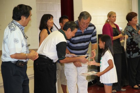 Good Citizen Award winner Taylor Alani pictured receiving her award certificate and $100 savings bond from Rotary Club of Pearlridge Board Members, Gordon Arakaki (second from right) and Dick Mosko (center) on Wednesday, May 23, 2012 during Momilani Elementary School's end of year awards assembly held in the school cafeteria.