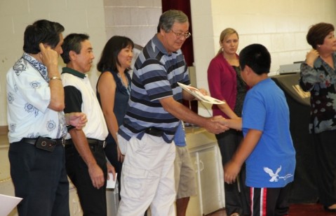 Good Citizen Award winner Ka'eo Bailon from Momilani Elementary School pictured receiving his award certificate and $100 savings bond from Rotary Club of Pearlridge Board Member Dick Mosko.