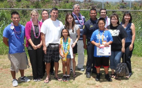 Momilani Elementary School Good Citizen Award winners Taylor Alani and Ka'eo Bailon are pictured with their parents and third grade teachers, Masaru Uchino (far left) and Leona Uyesato (far right) along with members of the Rotary Club of Pearlridge.