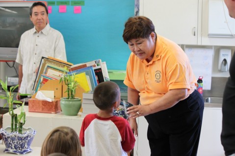 Rotary Club of Pearlridge President Doreen Higa presents a third grader from Palisades Elementary School with a free dictionary during the Dicitionary 5000 Project conducted at the beginning of the 2011-2012 school.