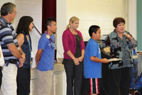 Rotary Club of Pearlridge President and Momilani Elementary School Principal Doreen Higa along with Pearlridge Rotarians and Momilani third grade teachers is pictured presenting Momilani Elementary School third grader Ka'eo Bailon with a Good Citizen Award in May during an awards assembly held in the school cafeteria. Momilani third grader Taylor Alani (not pictured) also received a Good Citizen Award.
