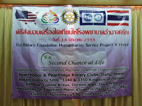 Mahalo banner recognizing Pearl Harbor and the Rotary Club of Pearlridge from District 5000 for their efforts in the "Second Chance at Life", Rotary Foundation Humanitarian Service Project in Thailand.