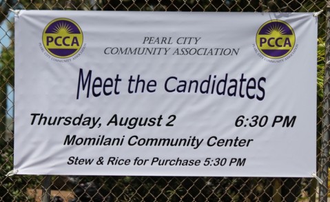 The Pearl City Community Association would like to invite the public to attend the upcoming "Meet the Candidates" Forum on Thursday, August 2, 2012 from 6:30- 8:30pm at the Momilani Community Center in Pearl City.
