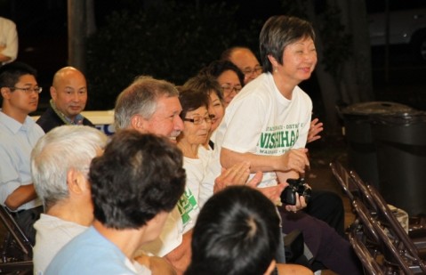 Honolulu Councilmember Breene Harimoto who served as emcee for the evening pictured here handing the mic to an attendee during the Q&A portion of the forum.