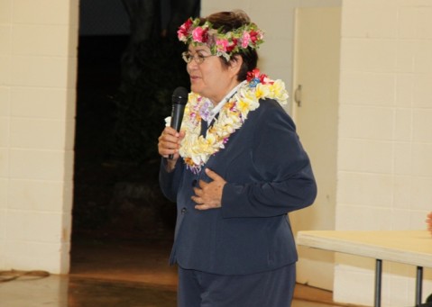 Mrs. Clarence Nishihara pictured having a great time while being introduced by her husband State Senator Nishihara.